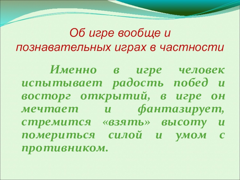 игре человек испытывает радость побед и восторг открытий, в игре он мечтает и фантазирует, стремится «взять» высоту и помериться силой и умом с противником.