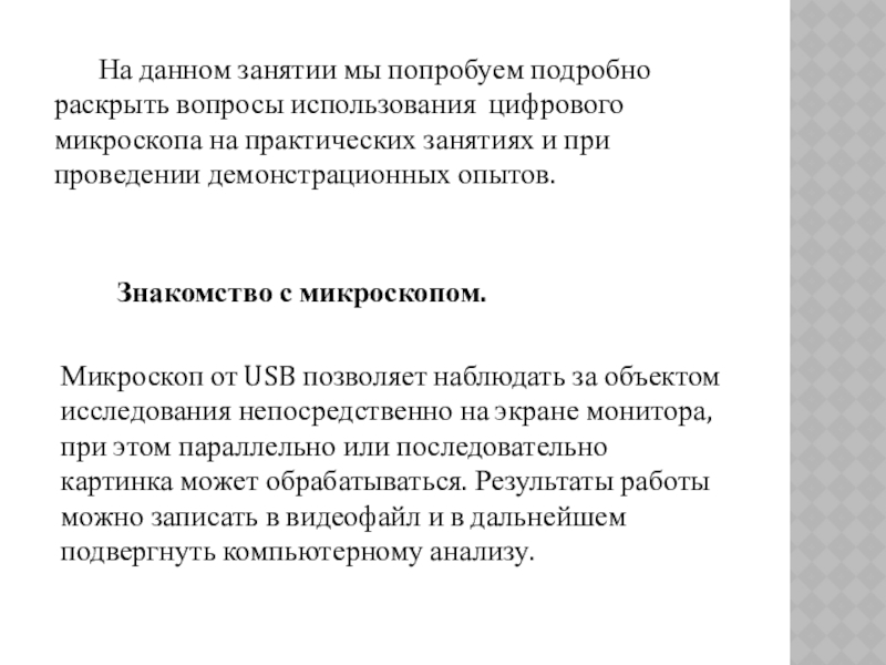 На данном занятии мы попробуем подробно раскрыть вопросы использования цифрового микроскопа на практических занятиях и при проведении демонстрационных опытов.