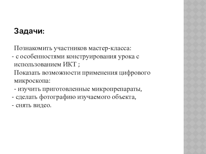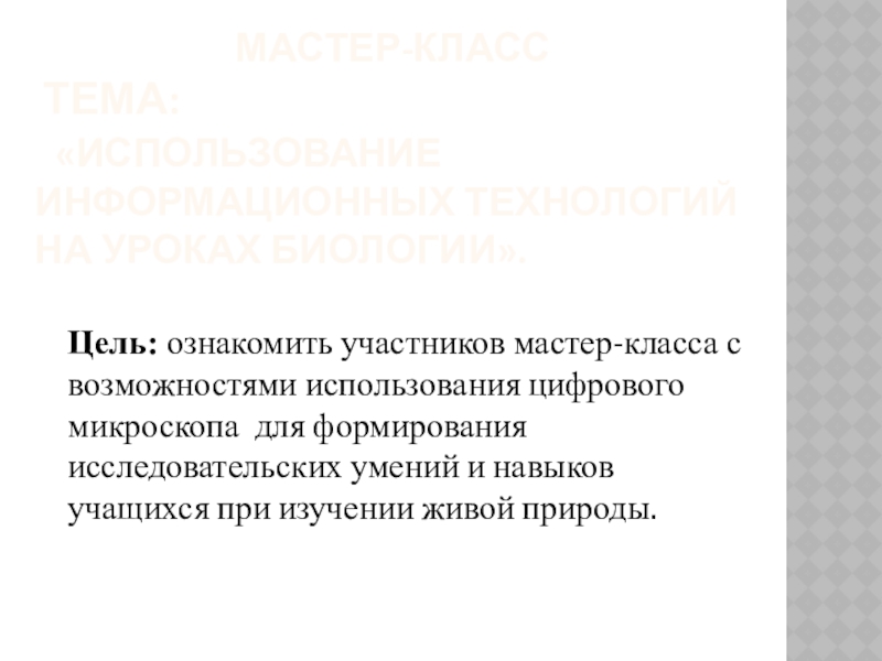 Цель: ознакомить участников мастер-класса с возможностями использования цифрового микроскопа для формирования исследовательских умений и навыков учащихся при изучении живой природы.