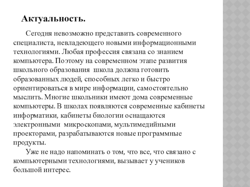 связана со знанием компьютера. Поэтому на современном этапе развития школьного образования школа должна готовить образованных людей, способных легко и быстро ориентироваться в мире информации, самостоятельно мыслить. Многие школьники имеют дома современные компьютеры. В школах появляются современные кабинеты информатики, кабинеты биологии оснащаются электронными микроскопами, мультимедийными проекторами, разрабатываются новые программные продукты.