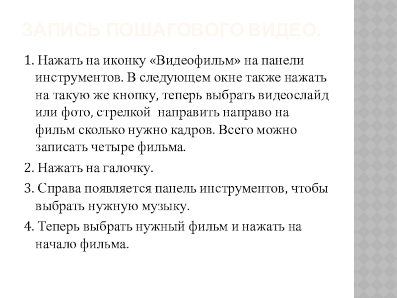 следующем окне также нажать на такую же кнопку, теперь выбрать видеослайд или фото, стрелкой направить направо на фильм сколько нужно кадров. Всего можно записать четыре фильма.