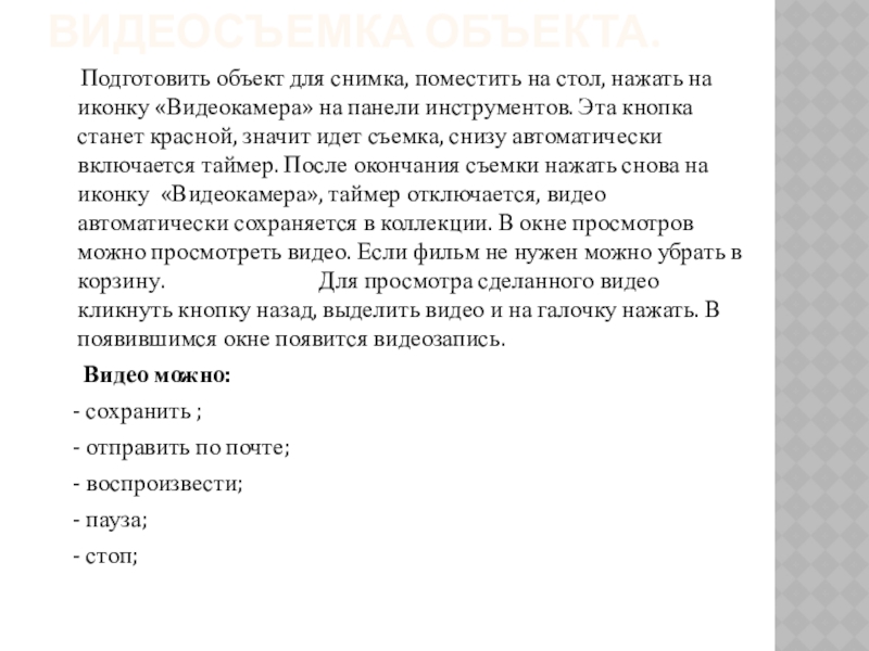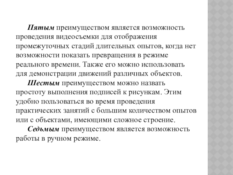 Слайд 11Пятым преимуществом является возможность проведения видеосъемки для отображения промежуточных стадий длительных