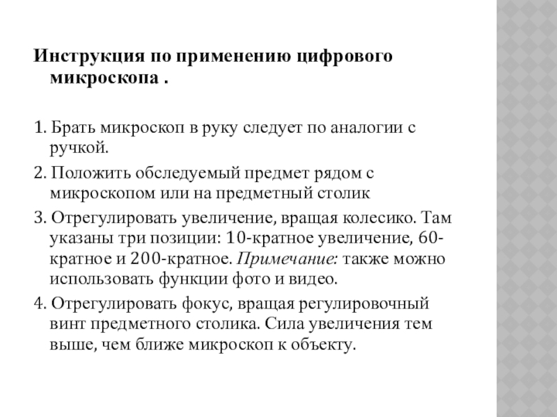 Слайд 14Инструкция по применению цифрового микроскопа .