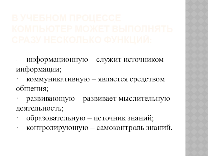 Слайд 5В учебном процессе компьютер может выполнять сразу несколько функций: