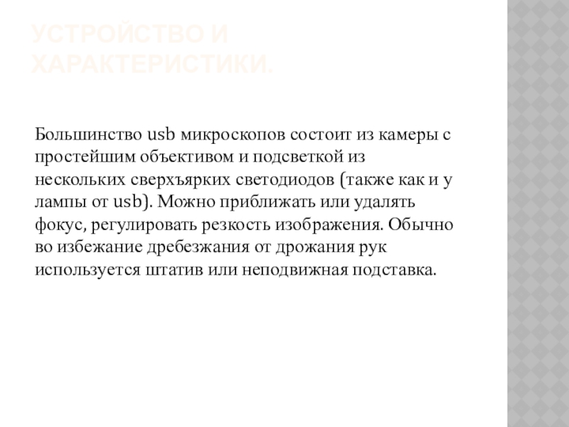и подсветкой из нескольких сверхъярких светодиодов (также как и у лампы от usb). Можно приближать или удалять фокус, регулировать резкость изображения. Обычно во избежание дребезжания от дрожания рук используется штатив или неподвижная подставка.