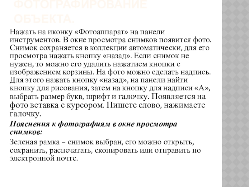 окне просмотра снимков появится фото. Снимок сохраняется в коллекции автоматически, для его просмотра нажать кнопку «назад». Если снимок не нужен, то можно его удалить нажатием кнопки с изображением корзины. На фото можно сделать надпись. Для этого нажать кнопку «назад», на панели найти кнопку для рисования, затем на кнопку для надписи «А», выбрать размер букв, шрифт и галочку. Появляется на фото вставка с курсором. Пишете слово, нажимаете галочку.