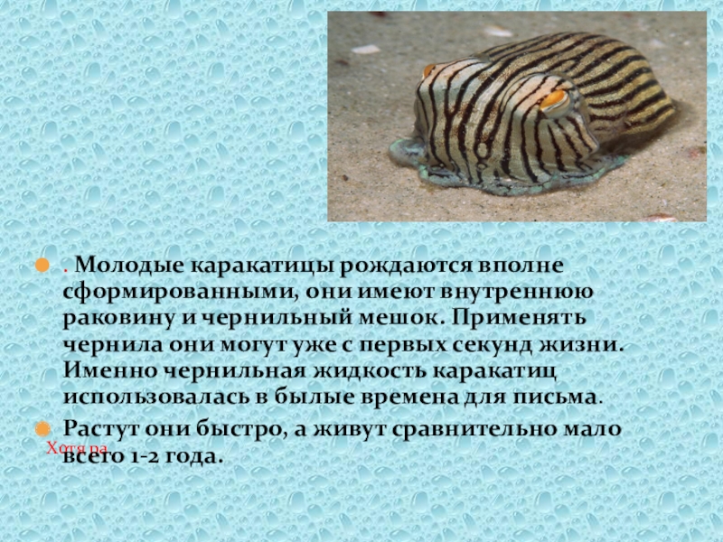 Такая смена окраски используется для маскировки и… общения. Рисунки определенной формы несут информацию для соплеменников. Вообще, каракатицы являются одними из самых разумных беспозвоночных.