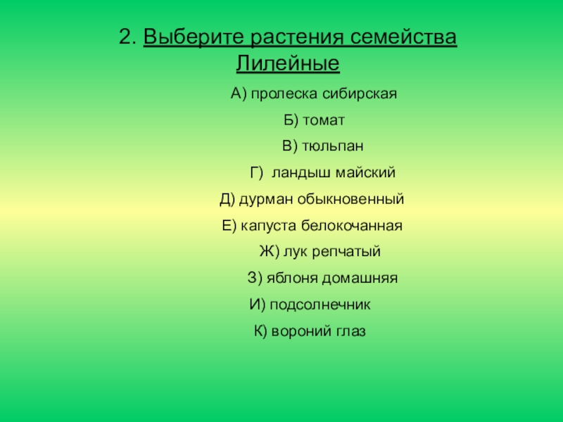 2. Выберите растения семейства Лилейные      А) пролеска сибирская