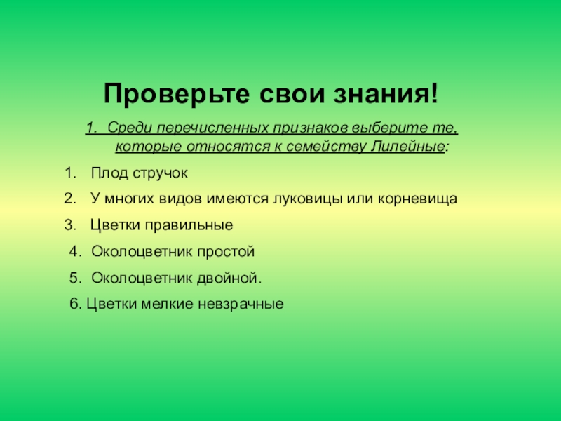 Проверьте свои знания!1. Среди перечисленных признаков выберите те, которые относятся к семейству Лилейные:Плод стручокУ многих видов имеются