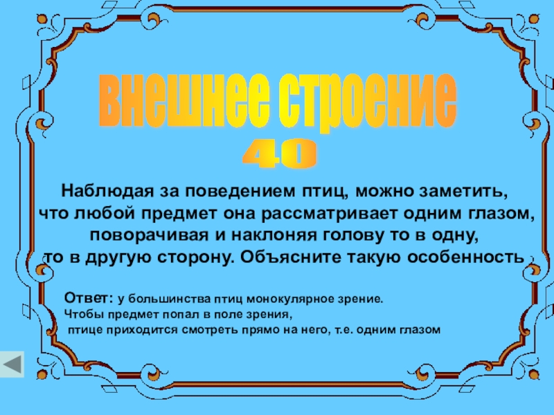 птице приходится смотреть прямо на него, т.е. одним глазом