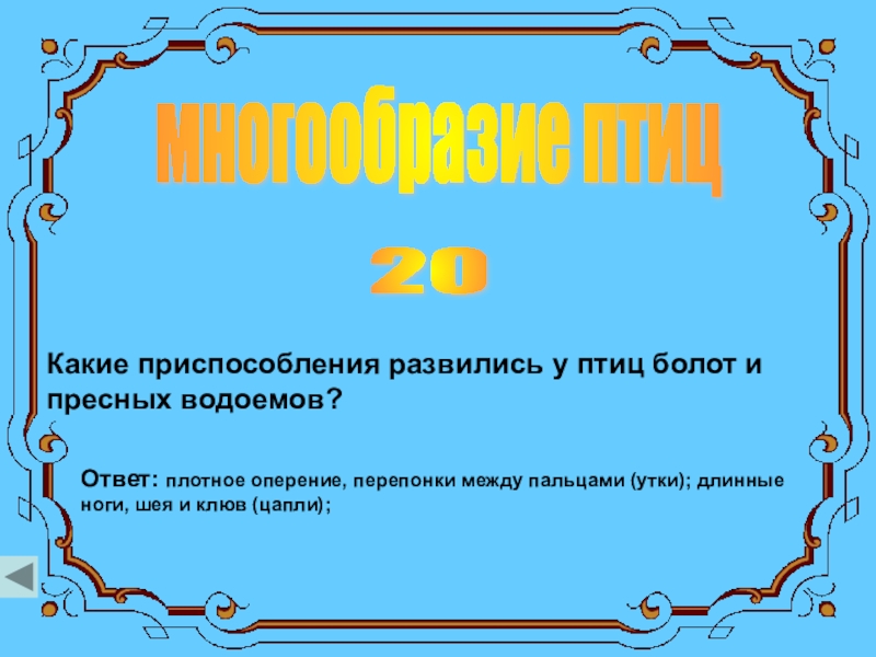 Ответ: плотное оперение, перепонки между пальцами (утки); длинные
