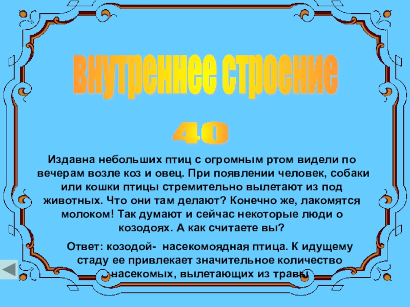 Ответ: козодой- насекомоядная птица. К идущему стаду ее привлекает значительное количество насекомых, вылетающих из травы
