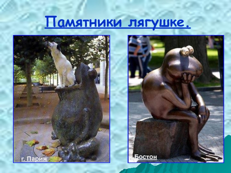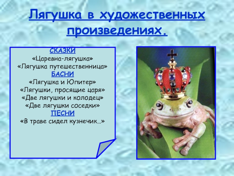 Лягушка в художественных произведениях.СКАЗКИ«Царевна-лягушка»«Лягушка путешественница»БАСНИ«Лягушка и Юпитер»«Лягушки, просящие царя»«Две лягушки и колодец»«Две лягушки соседки»ПЕСНИ«В траве сидел кузнечик…»