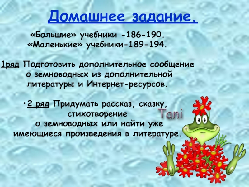 Домашнее задание.«Большие» учебники -186-190.«Маленькие» учебники-189-194.1ряд Подготовить дополнительное сообщение о земноводных из дополнительной литературы и Интернет-ресурсов.2 ряд Придумать