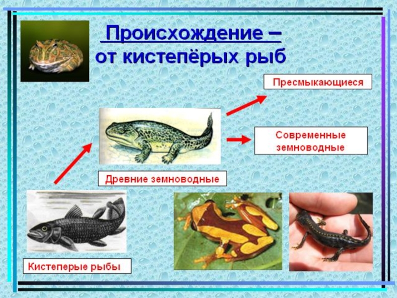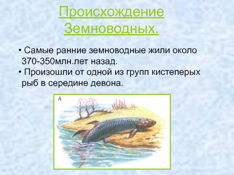 Происхождение Земноводных. Самые ранние земноводные жили около 370-350млн.лет назад. Произошли от одной из групп кистеперых рыб в