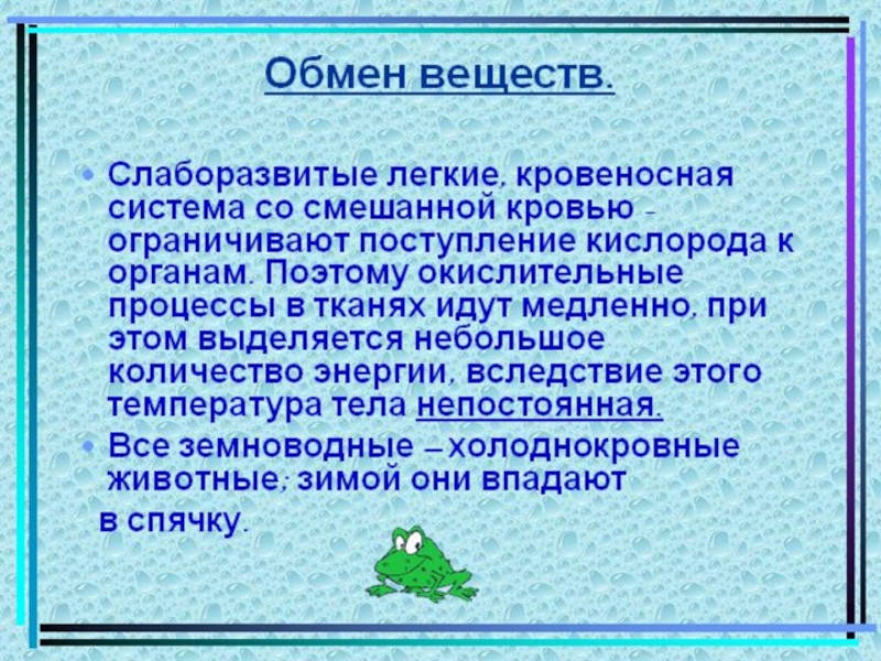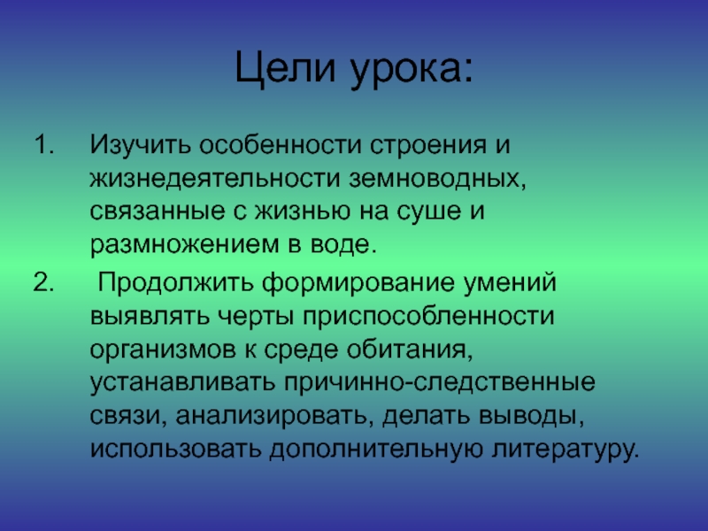 Цели урока:Изучить особенности строения и жизнедеятельности земноводных, связанные с жизнью на суше и размножением в воде. Продолжить