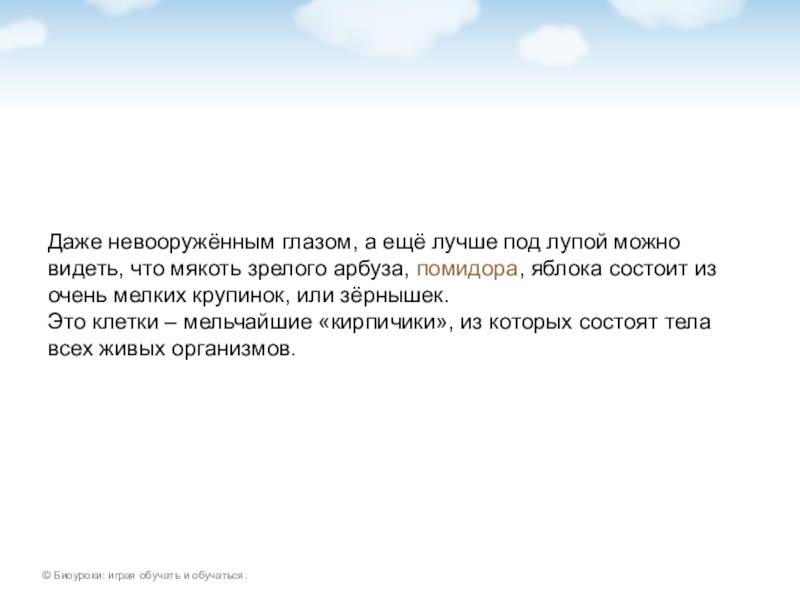 Что делаем: Рассмотрите микропрепарат под микроскопом. Найдите отдельные клетки и рассмотрите при малом увеличении (10х6), а затем при большом (10х30).