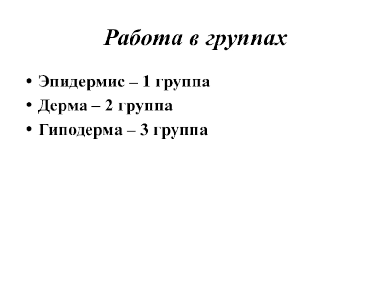 Работа в группахЭпидермис – 1 группаДерма – 2 группаГиподерма – 3 группа