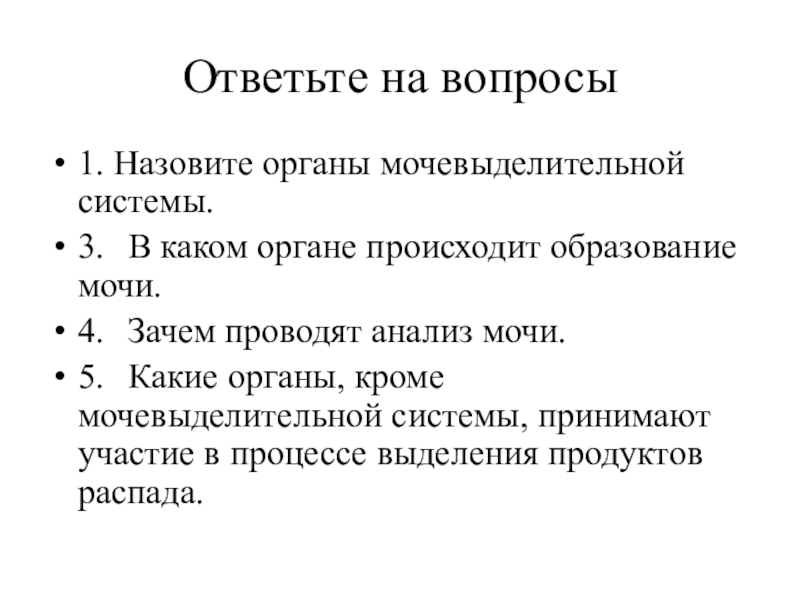 Ответьте на вопросы1. Назовите органы мочевыделительной системы.3. В каком органе происходит образование мочи.4. Зачем проводят анализ мочи.5. Какие органы, кроме мочевыделительной системы, принимают участие в процессе выделения продуктов распада.