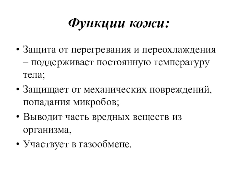 Функции кожи:Защита от перегревания и переохлаждения – поддерживает постоянную температуру тела;Защищает от механических повреждений, попадания микробов;Выводит часть