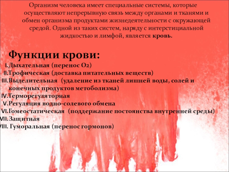 Выделительная (удаление из тканей лишней воды, солей и конечных продуктов метоболизма)