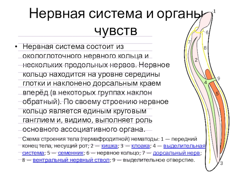 Схема строения тела (гермафродитной) нематоды: 1 — передний конец тела, несущий рот; 2 — кишка; 3 — клоака; 4 — выделительная система; 5 — семенник; 6 — нервное кольцо; 7 — дорсальный нерв; 8 — вентральный нервный ствол; 9 — выделительное отверстие.