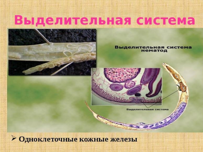 У большинства почвенных и паразитических нематод шейная железа связана с длинными экскреторными каналами, расположенными в боковых утолщениях гиподермы. У лошадиной аскариды, достигающей 40 см длины, такая выделительная система образована одной гигантской клеткой.