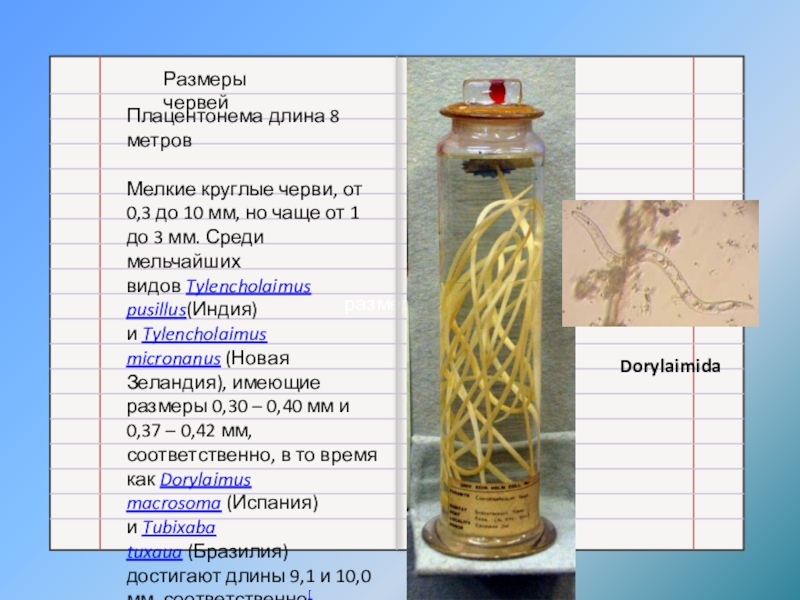 10 мм, но чаще от 1 до 3 мм. Среди мельчайших видов Tylencholaimus pusillus(Индия) и Tylencholaimus micronanus (Новая Зеландия), имеющие размеры 0,30 – 0,40 мм и 0,37 – 0,42 мм, соответственно, в то время как Dorylaimus macrosoma (Испания) и Tubixaba tuxaua (Бразилия) достигают длины 9,1 и 10,0 мм, соответственно[