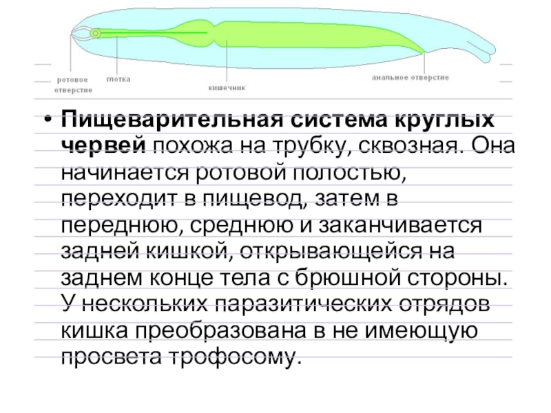 Слайд 10Пищеварительная система круглых червей похожа на трубку, сквозная. Она начинается ротовой полостью,