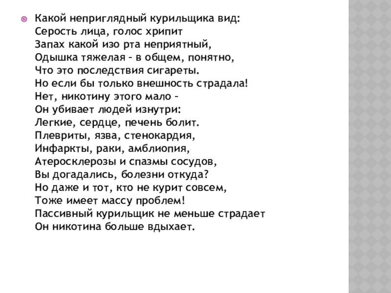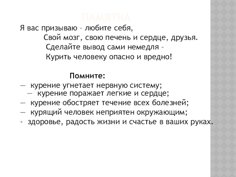 — курение угнетает нервную систему; — курение поражает легкие и сердце;