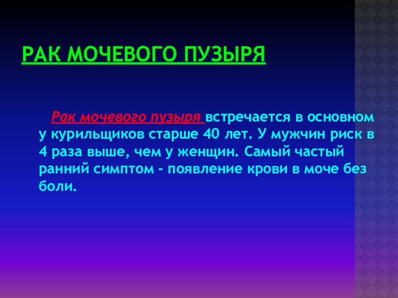 старше 40 лет. У мужчин риск в 4 раза выше, чем у женщин. Самый частый ранний симптом - появление крови в моче без боли.