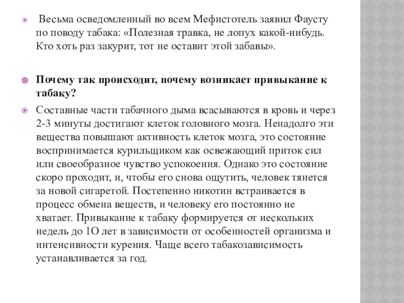 Слайд 6 Весьма осведомленный во всем Мефистотель заявил Фаусту по поводу табака: