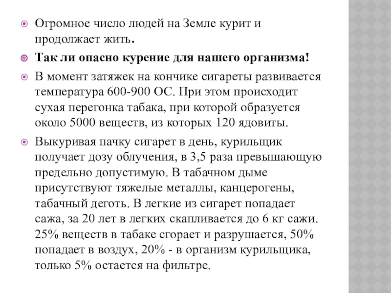 Выкуривая пачку сигарет в день, курильщик получает дозу облучения, в 3,5 раза превышающую предельно допустимую. В табачном дыме присутствуют тяжелые металлы, канцерогены, табачный деготь. В легкие из сигарет попадает сажа, за 20 лет в легких скапливается до 6 кг сажи. 25% веществ в табаке сгорает и разрушается, 50% попадает в воздух, 20% - в организм курильщика, только 5% остается на фильтре.