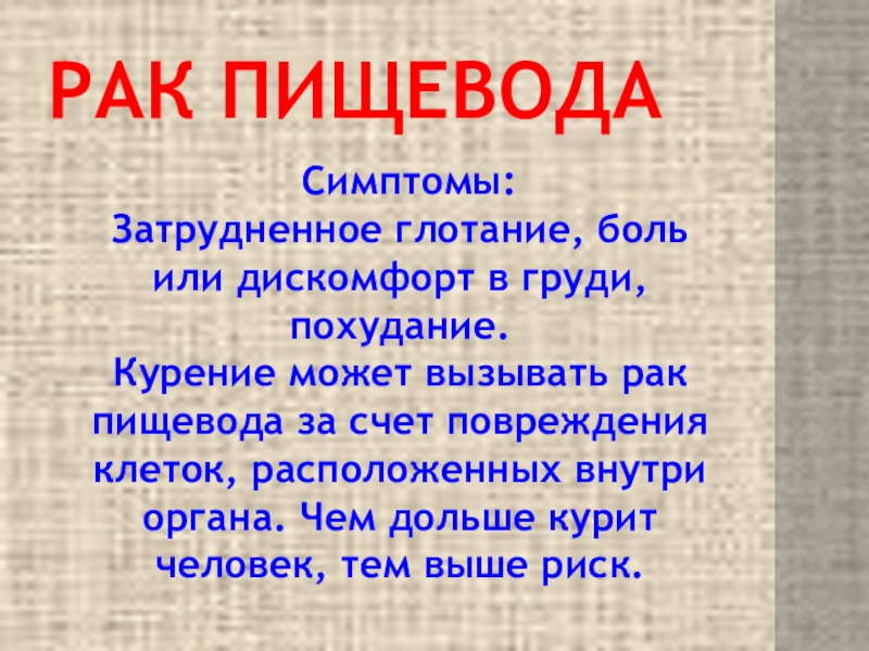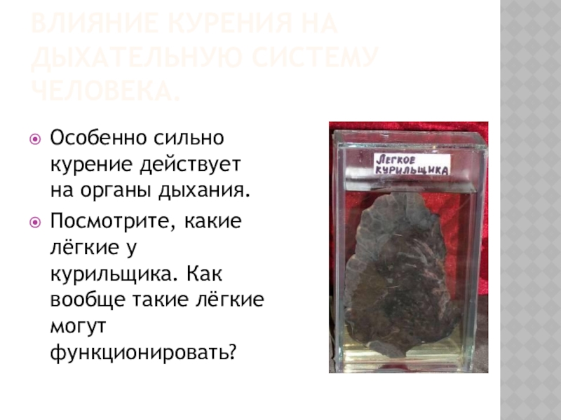 Слайд 24ВЛИЯНИЕ КУРЕНИЯ НА ДЫХАТЕЛЬНУЮ СИСТЕМУ ЧЕЛОВЕКА.