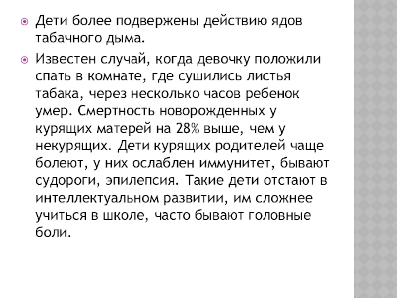положили спать в комнате, где сушились листья табака, через несколько часов ребенок умер. Смертность новорожденных у курящих матерей на 28% выше, чем у некурящих. Дети курящих родителей чаще болеют, у них ослаблен иммунитет, бывают судороги, эпилепсия. Такие дети отстают в интеллектуальном развитии, им сложнее учиться в школе, часто бывают головные боли.