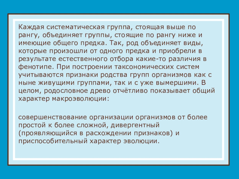 рангу ниже и имеющие общего предка. Так, род объединяет виды, которые произошли от одного предка и приобрели в результате естественного отбора какие-то различия в фенотипе. При построении таксономических систем учитываются признаки родства групп организмов как с ныне живущими группами, так и с уже вымершими. В целом, родословное древо отчётливо показывает общий характер макроэволюции: