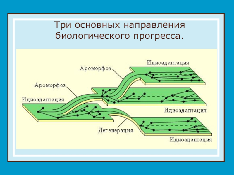 совершенствование организации организмов от более простой к более сложной, дивергентный (проявляющийся в расхождении признаков) и приспособительный характер эволюции.