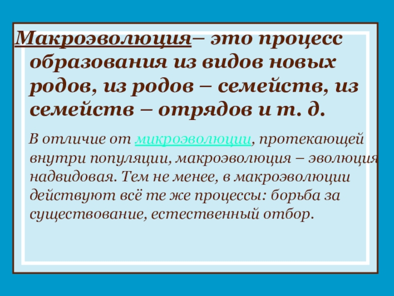 В отличие от микроэволюции, протекающей внутри популяции, макроэволюция – эволюция надвидовая. Тем не менее, в макроэволюции действуют всё те же процессы: борьба за существование, естественный отбор.