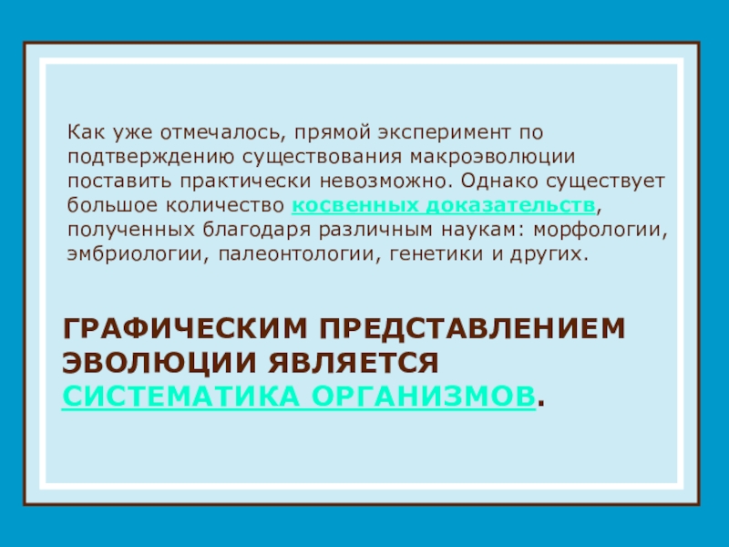 Графическим представлением эволюции является систематика организмов. Как уже отмечалось, прямой эксперимент по подтверждению существования макроэволюции поставить практически
