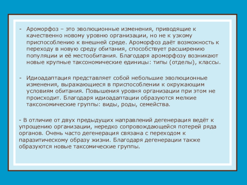 новому уровню организации, но не к узкому приспособлению к внешней среде. Ароморфоз даёт возможность к переходу в новую среду обитания, способствует расширению популяции и её местообитания. Благодаря ароморфозу возникают новые крупные таксономические единицы: типы (отделы), классы.