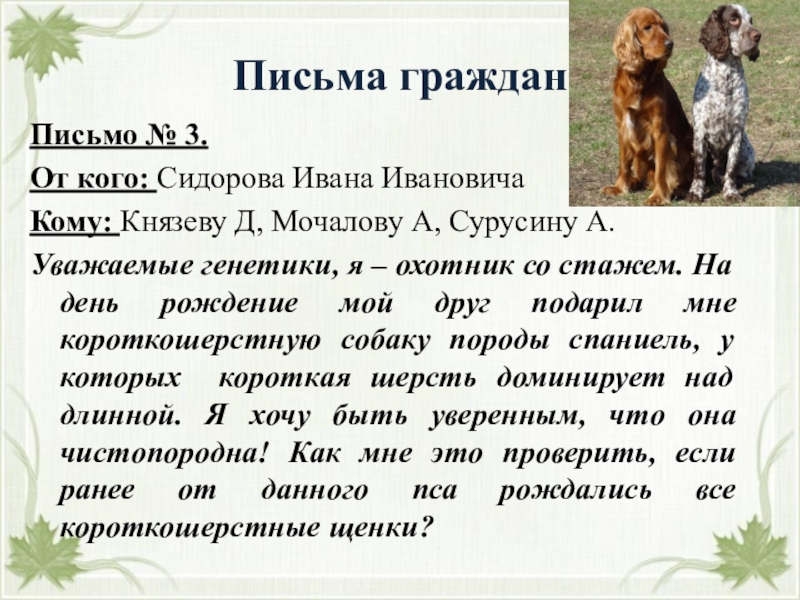Уважаемые генетики, я – охотник со стажем. На день рождение мой друг подарил мне короткошерстную собаку породы спаниель, у которых короткая шерсть доминирует над длинной. Я хочу быть уверенным, что она чистопородна! Как мне это проверить, если ранее от данного пса рождались все короткошерстные щенки?