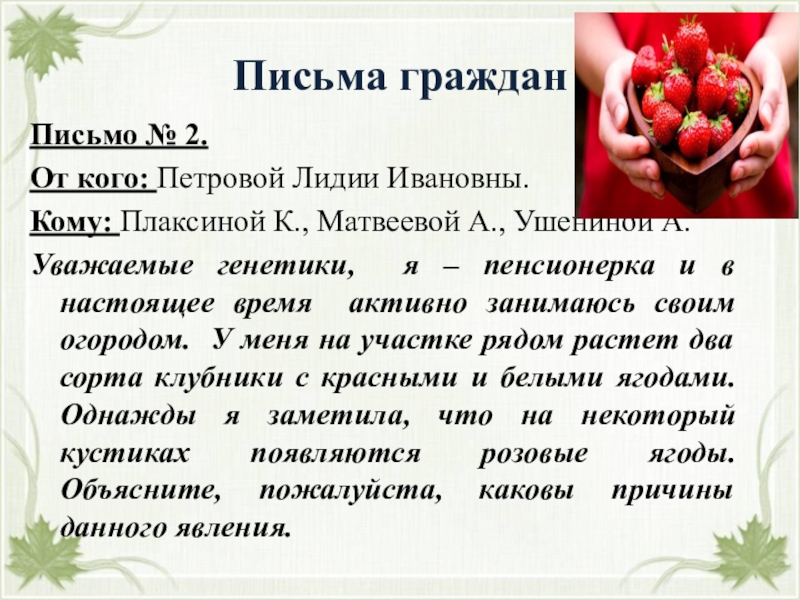 Уважаемые генетики, я – пенсионерка и в настоящее время активно занимаюсь своим огородом. У меня на участке рядом растет два сорта клубники с красными и белыми ягодами. Однажды я заметила, что на некоторый кустиках появляются розовые ягоды. Объясните, пожалуйста, каковы причины данного явления.