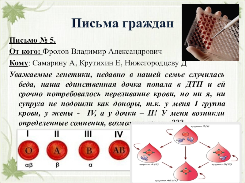 Уважаемые генетики, недавно в нашей семье случилась беда, наша единственная дочка попала в ДТП и ей срочно потребовалось переливание крови, но ни я, ни супруга не подошли как доноры, т.к. у меня I группа крови, у жены - IV, а у дочки – II! У меня возникли определенные сомнения, возможно ли это???