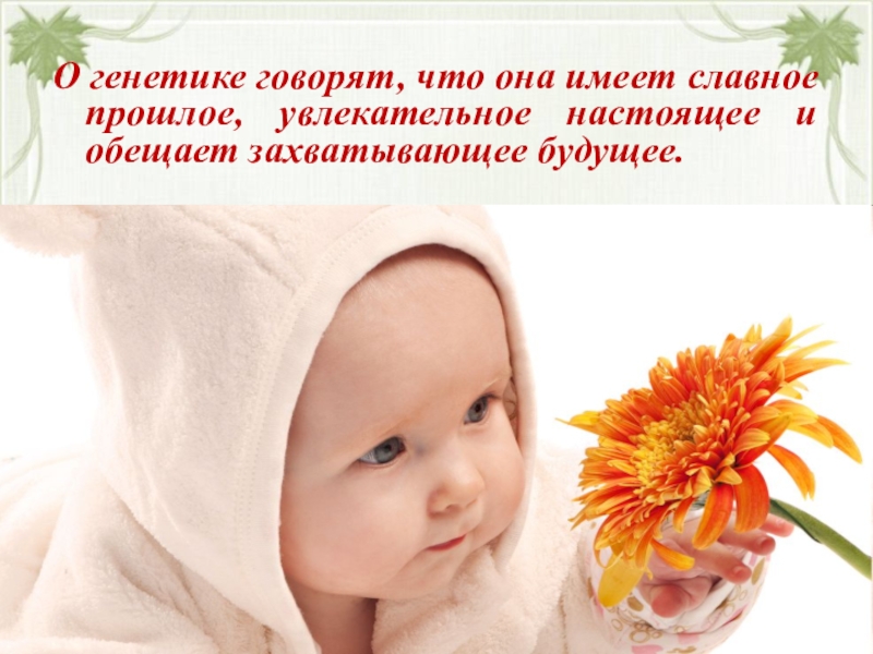Слайд 12О генетике говорят, что она имеет славное прошлое, увлекательное настоящее и