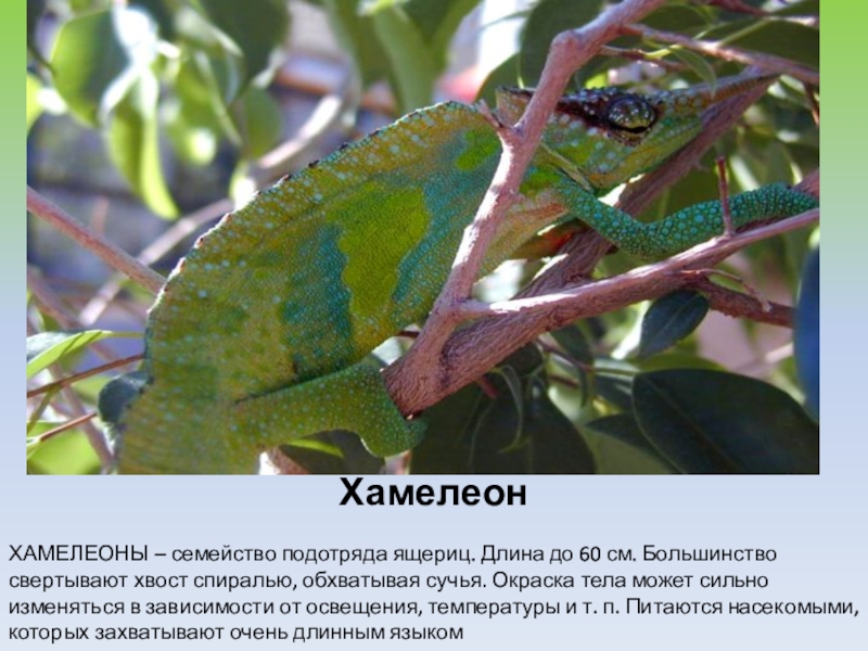 ХАМЕЛЕОНЫ – семейство подотряда ящериц. Длина до 60 см. Большинство свертывают