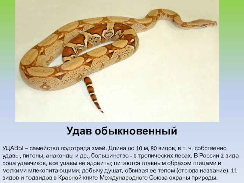видов, в т. ч. собственно удавы, питоны, анаконды и др., большинство - в тропических лесах. В России 2 вида рода удавчиков, все удавы не ядовиты; питаются главным образом птицами и мелкими млекопитающими; добычу душат, обвивая ее телом (отсюда название). 11 видов и подвидов в Красной книге Международного Союза охраны природы.