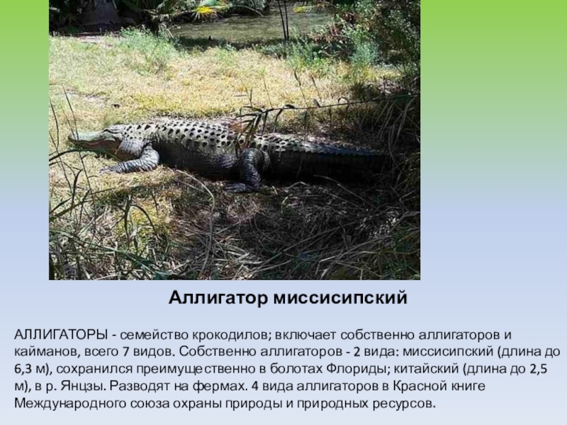 7 видов. Собственно аллигаторов - 2 вида: миссисипский (длина до 6,3 м), сохранился преимущественно в болотах Флориды; китайский (длина до 2,5 м), в р. Янцзы. Разводят на фермах. 4 вида аллигаторов в Красной книге Международного союза охраны природы и природных ресурсов.