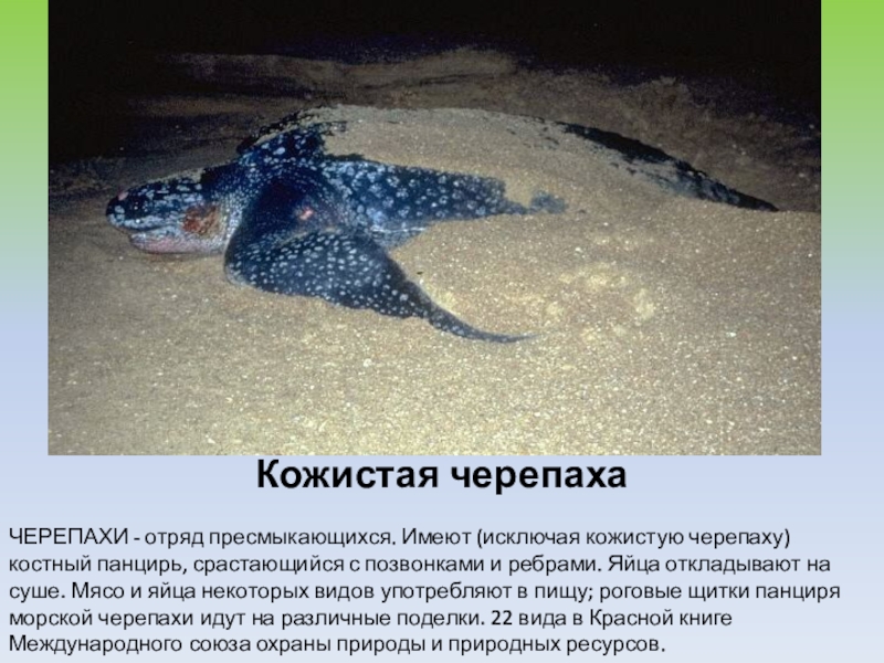 срастающийся с позвонками и ребрами. Яйца откладывают на суше. Мясо и яйца некоторых видов употребляют в пищу; роговые щитки панциря морской черепахи идут на различные поделки. 22 вида в Красной книге Международного союза охраны природы и природных ресурсов.