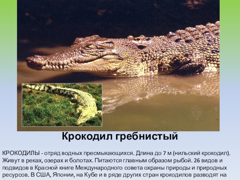КРОКОДИЛЫ - отряд водных пресмыкающихся. Длина до 7 м (нильский