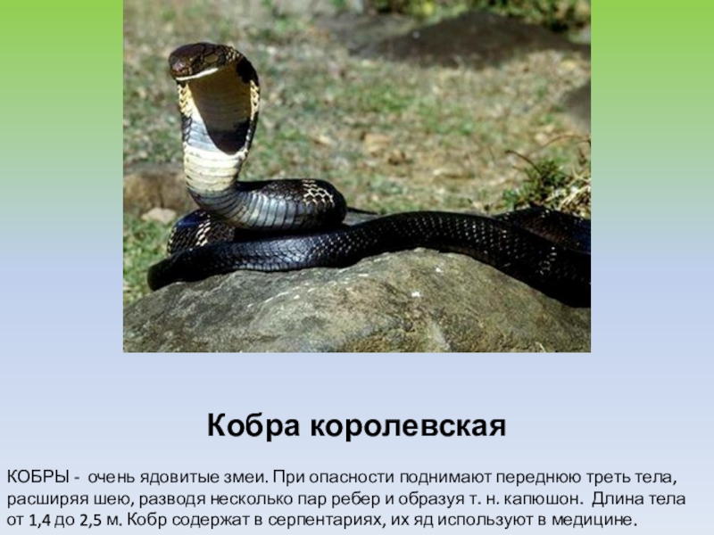 КОБРЫ - очень ядовитые змеи. При опасности поднимают переднюю треть